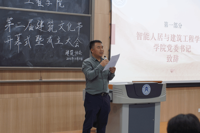 为提升学生专业素养,推动学术交流与文化传承,10 月 16 日晚 7:30,智能人居与建筑工程学院在明德楼 B 负 106 教室隆重举行第二届建筑文化节开幕式。学院党委书记王照安、党委副书记罗冬丽、学院教师何伟及各班学生代表出席活动。